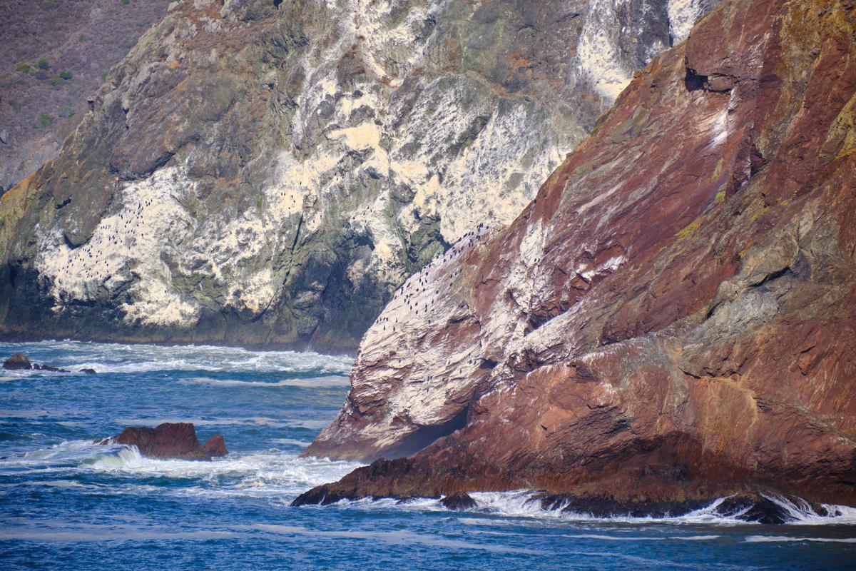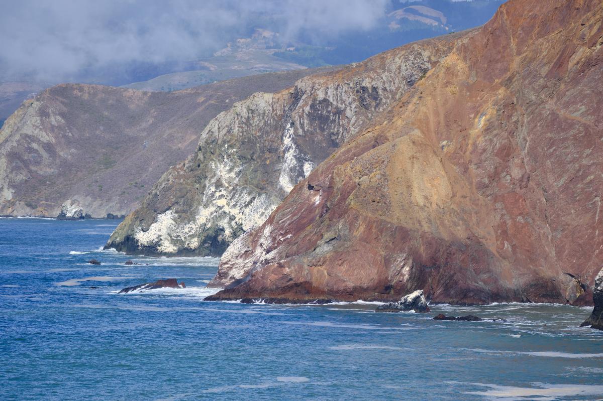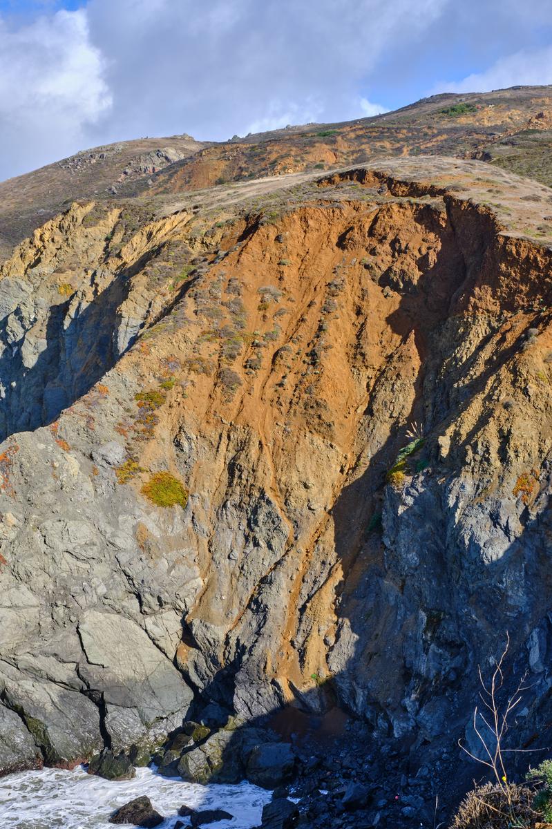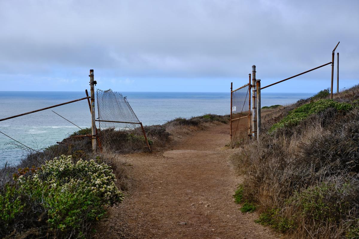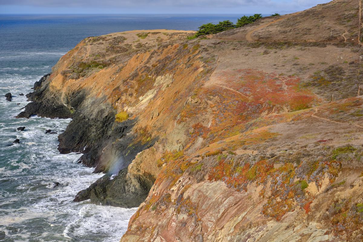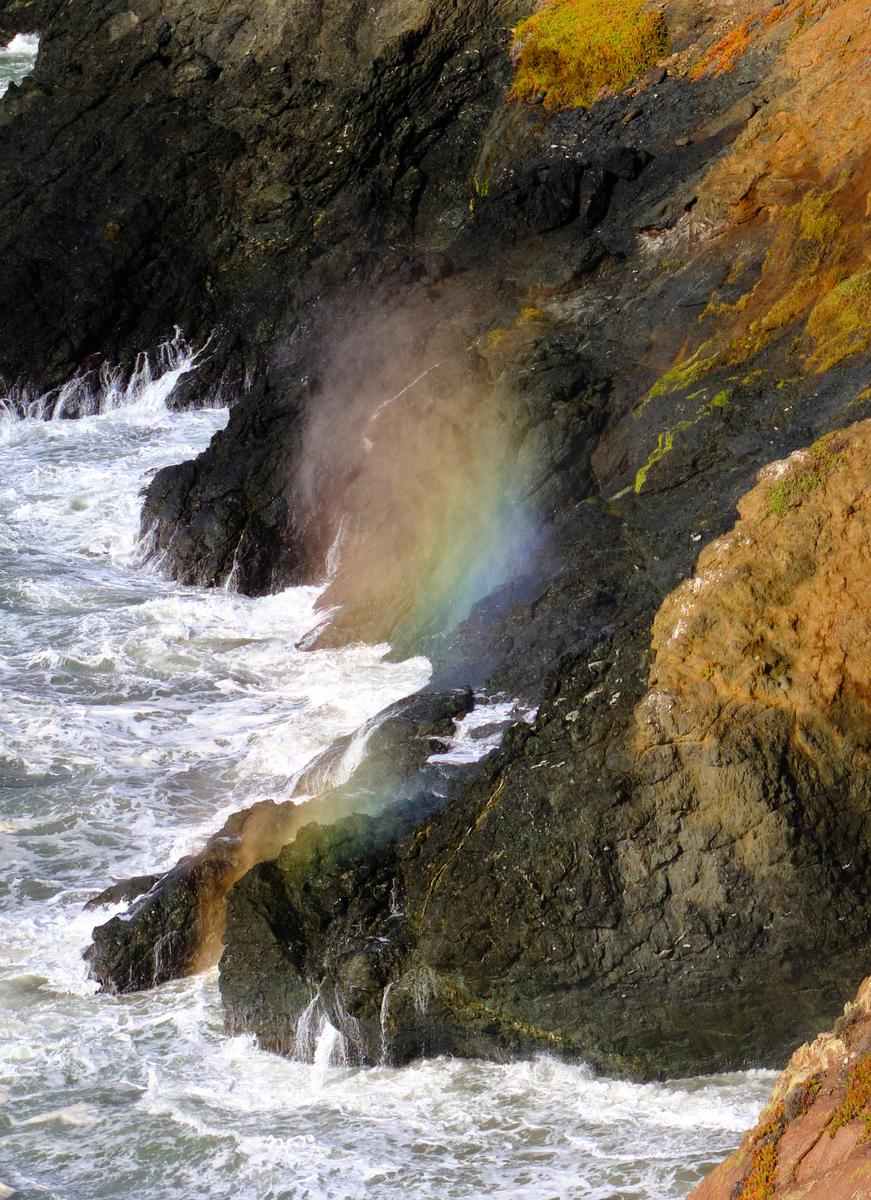 From Rodeo Lagoon there is a trail to the North end of the beach that goes along the coast. I’m not sure I took the ‘official’ trail but wanted to keep to the coast and not go too far inland/up. At first you have great views back along the beach, but just as interesting is the colourful hillsides and little inlets. At first I thought the rainbow was some kind of lens artefact, until I realised it was a rainbow from the breaking waves! I reached a gate that did not appear to have been closed for a long time…